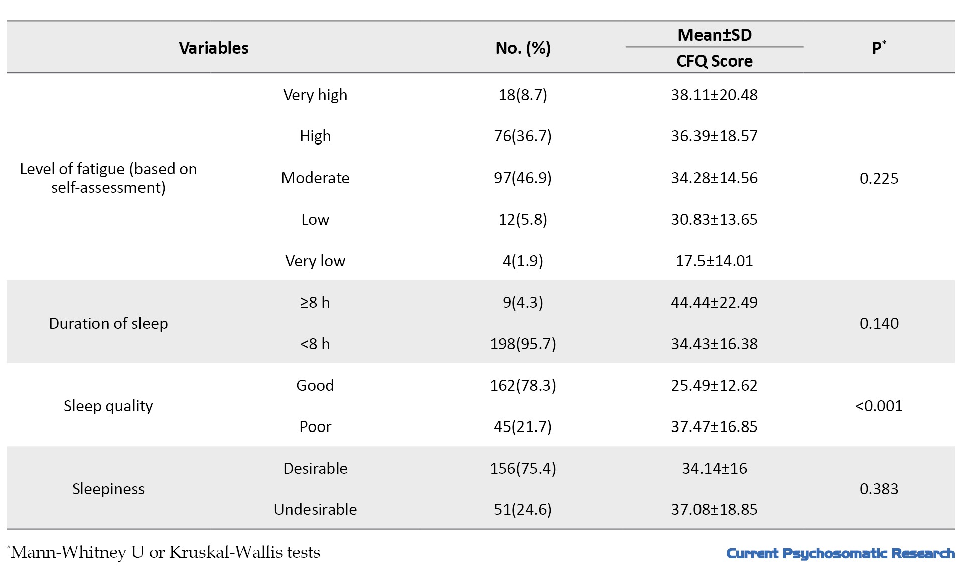 Table 1, the CFQ score was significantly different based on academic satisfaction (P=0.039), use of specific medication (P=0.005), average time spent using mobile applications and the internet (P=0.018), buying shifts (P=0.038), satisfaction with living conditions (P=0.003), study level (P=0.009), and sleep quality (P<0.001).