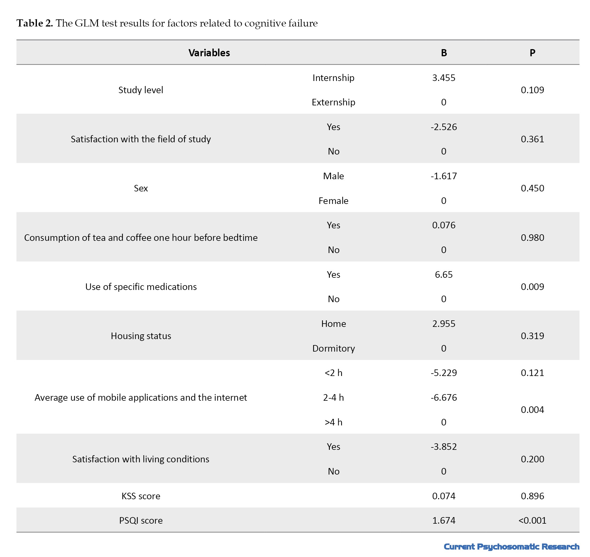 Spearman’s correlation test results revealed a positive relationship between poor sleep quality and cognitive failure (r=0.398, P<0.001), but not between sleepiness and cognitive failure (P>0.05). By eliminating the effect of confounding factors using the GLM multiple test, a positive and significant association was observed between cognitive failure and the factors of sleep quality (P<0.001, β=1.67), use of specific medications (P=0.009, β=6.65), and average use of mobile applications and the internet (P=0.004, β=-6.67) with in medical students (