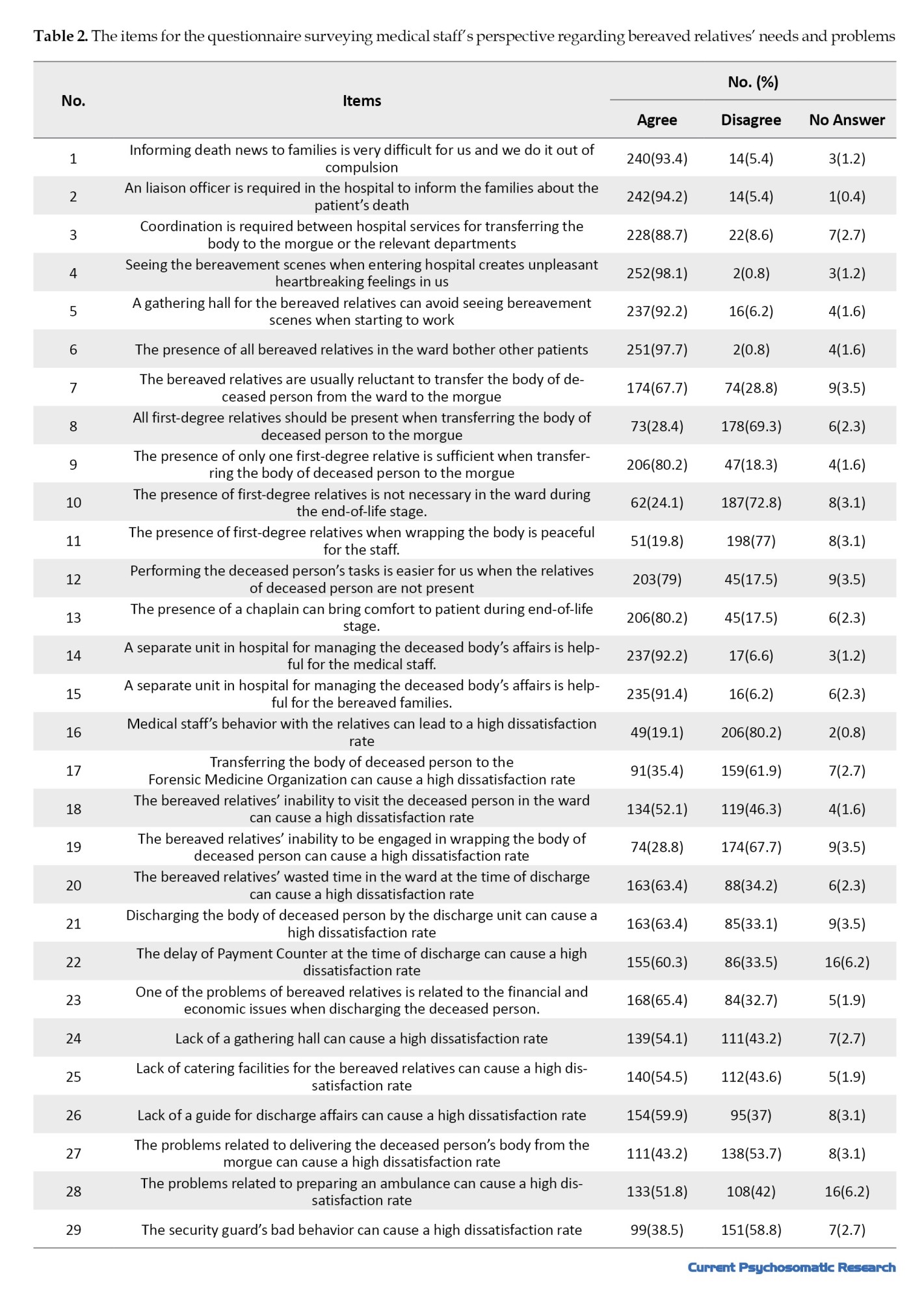 About 73% of medical staff perceived the presence of the patient’s first-degree relatives at the end of life stage as necessary, while 80% stated that the presence of a chaplain at the end of life can provide emotional comfort to the relatives. More than 90% stated that the existence of a separate unit in the hospital for decedent affairs can be helpful for both the families and the medical staff. More than 90% believed that informing the families about the patient’s death is a difficult task for them and that they do it out of compulsion. Also, 94% perceived it necessary to have a liaison officer in the hospital to inform the families about the patient’s death. More than 97% stated that the presence of all bereaved relatives in the ward can bother other patients. Furthermore, 80% stated that the presence of only one first-degree relative when transferring the deceased person from the ward to the mortuary is sufficient, and when there is no companion, the medical staff can better perform the tasks related to the deceased person. Moreover, 98% stated that seeing the bereaved people upon entering the hospital makes them uncomfortable, and 92% recommended the presence of a gathering hall in the hospital to avoid seeing heartbreaking scenes when starting to work. Also, most medical staff opposed the idea that referring the deceased to the morgue could cause severe dissatisfaction among grieving relatives (