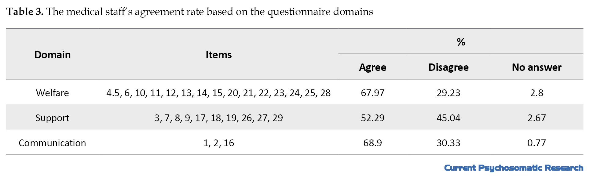 The mean score of the questionnaire surveying the perspective of the medical staff was 62.24±7.4, ranging 42-79. The highest agreement rate was related to the communication domain, followed by the welfare and support domains, and the highest disagreement rate was related to the support domain, followed by communication and welfare domains (