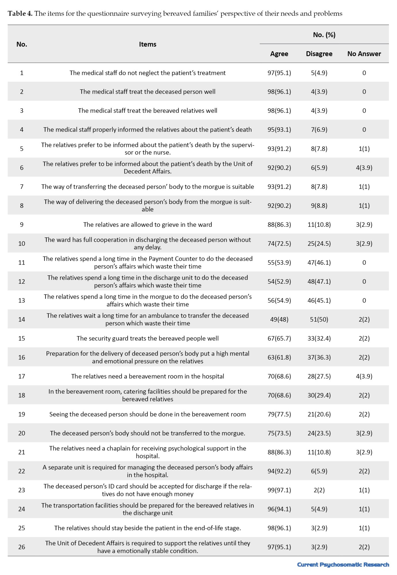 More than 90% of bereaved families stated that they needed to be with their patient in the ward during his/her end-of-life moments. More than 90% agreed that there is a need for a separate unit in the hospital to deal with the affairs of the deceased person and that this unit should support them to assess their mental and emotional state. About 97% agreed that if the families do not have enough money at the time of discharge, they should accept the deceased person’s ID card and discharge him/her. About 94% reported the need to receive transportation services at the discharge unit (