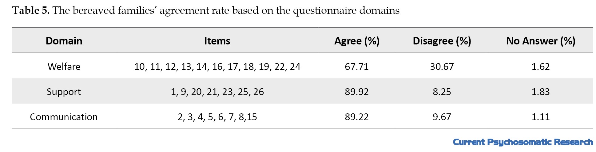 The mean score of the questionnaire surveying the perspective of bereaved families was 66.04±6.97, ranging 52-86. The highest agreement rate was related to the support domain, followed by communication and welfare dimensions, while the highest disagreement rate was related to the welfare domain, followed by communication and support domains (