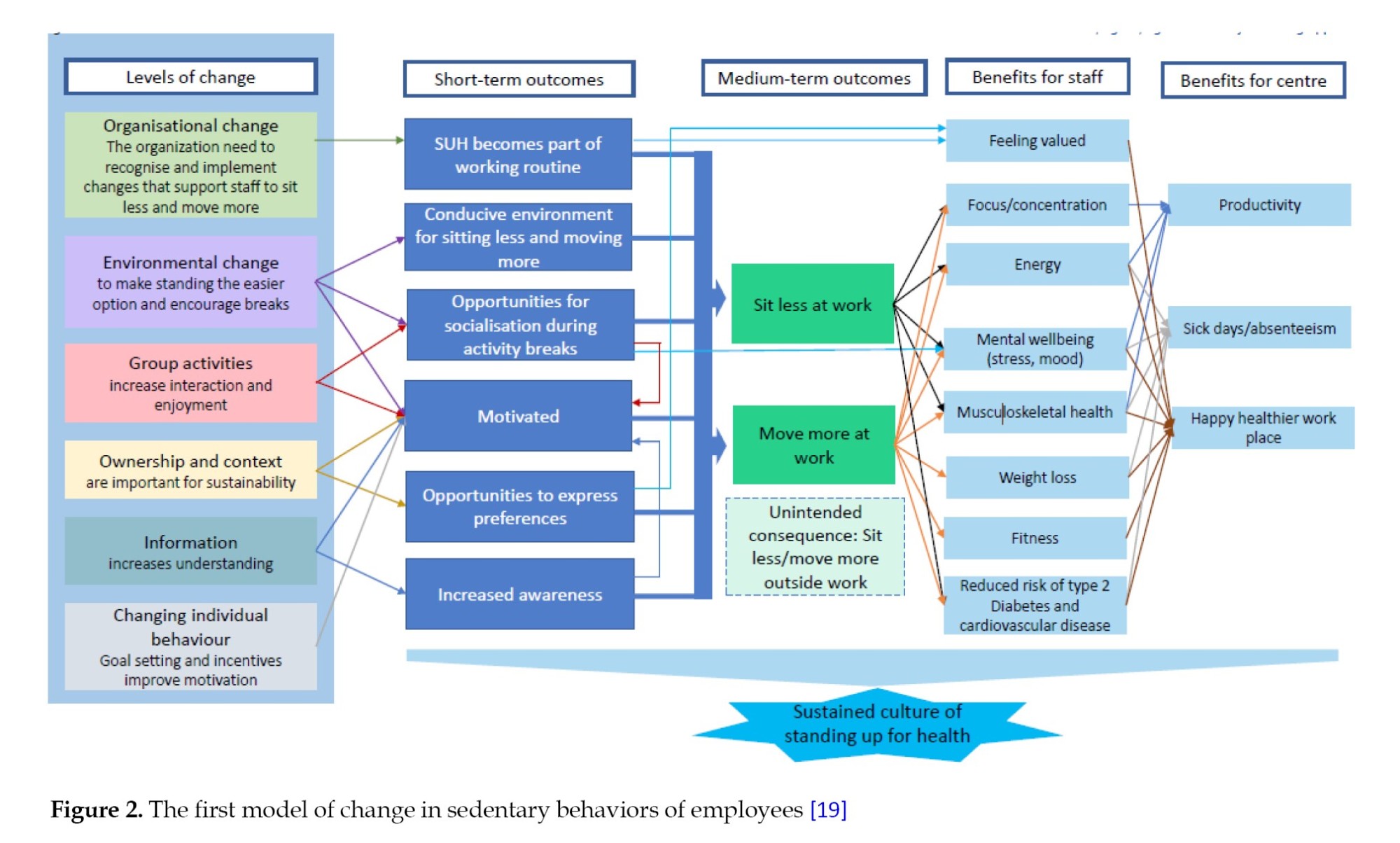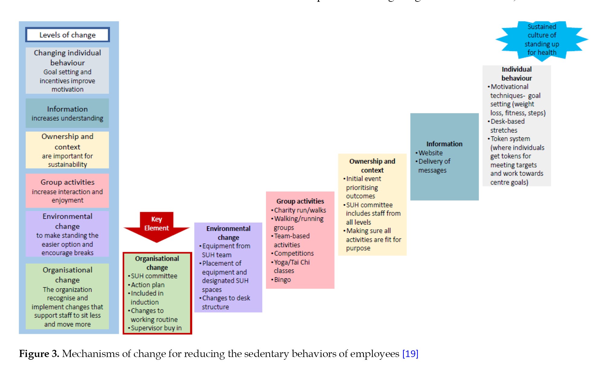As an example, the third step of developing the “Stand Up for Health” intervention [19] addressed how each modifiable factor identified in the second step can be changed at four levels: Individual, social, environmental, and organizational, through the design of specific mechanisms (