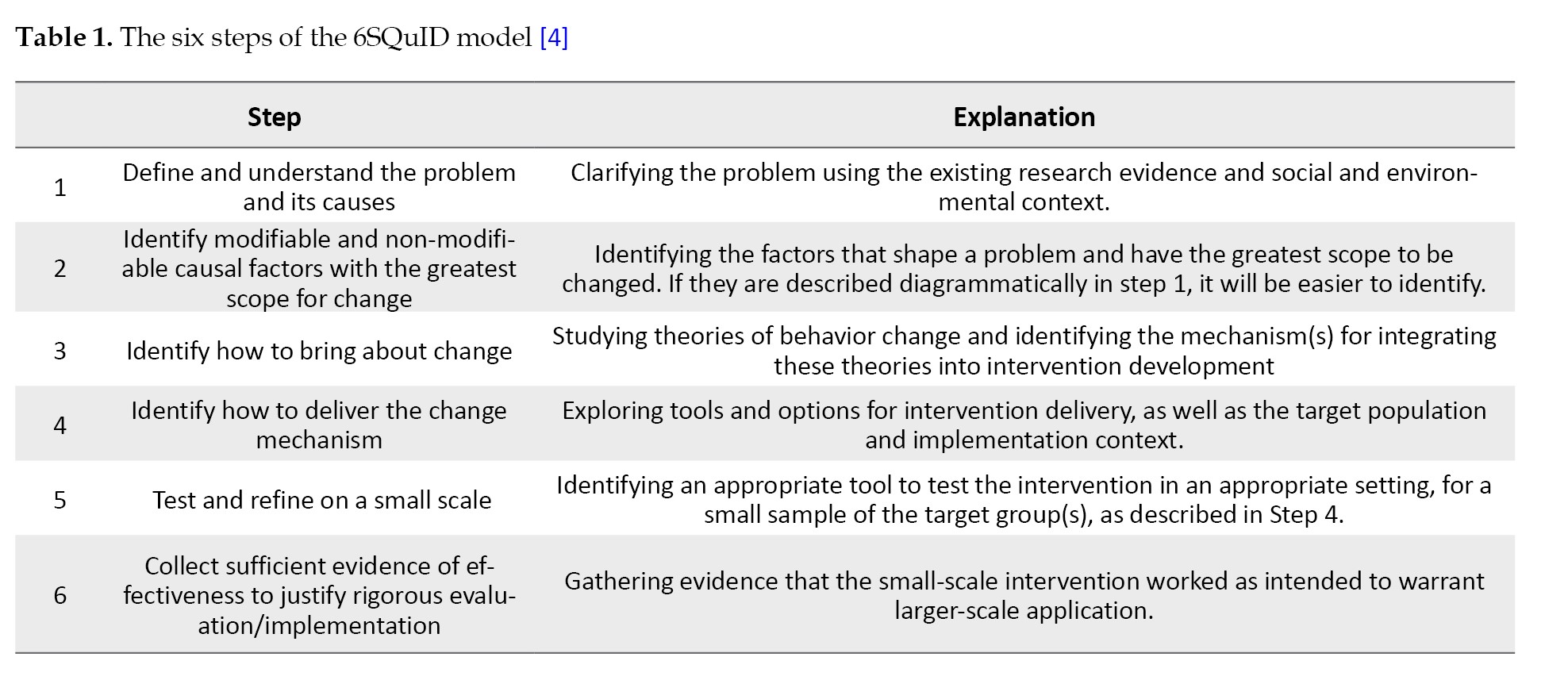 The 6SQuID model of Wight et al. [4] was developed with a focus on public health. The goal of this model is to provide a practical framework for researchers and professionals who face complex issues and diverse contexts in designing, implementing, and evaluating interventions. This model attempts to provide a systematic approach to developing effective interventions, taking into account field realities. This model emphasizes careful problem analysis, identification of modifiable factors, context-appropriate intervention design, and continuous evaluation and modification. The step-by-step structure and logical arrangement of the model’s components are among the features that make it a suitable option for cases where specific guidance is not available. Some researchers believe that the model, although clearly structured, provides more of a general framework than a detailed and precise strategy [4, 11]. This view is not because of the model’s shortcomings, but because of its flexible nature for different types of interventions. Although not based on a specific theory in psychology or social science, the 6SQuID model is based on key concepts drawn from behavioral science, public health, and implementation studies. Concepts such as context analysis, identification of influential factors, behavior change mechanisms, and formative evaluation are integrated into the various stages of this model.