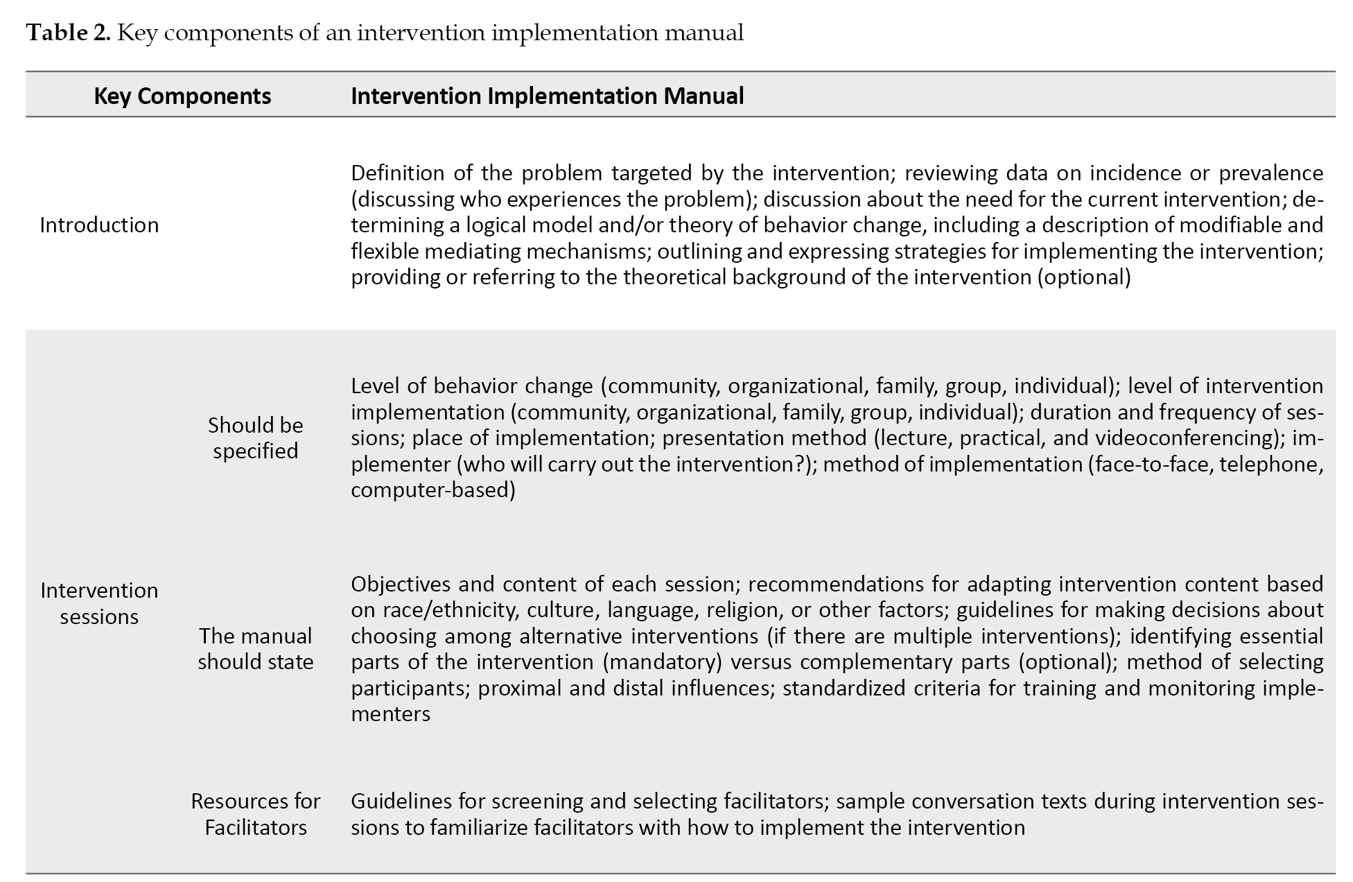 Table 2 can lead to the development of a clear and efficient intervention implementation manual.