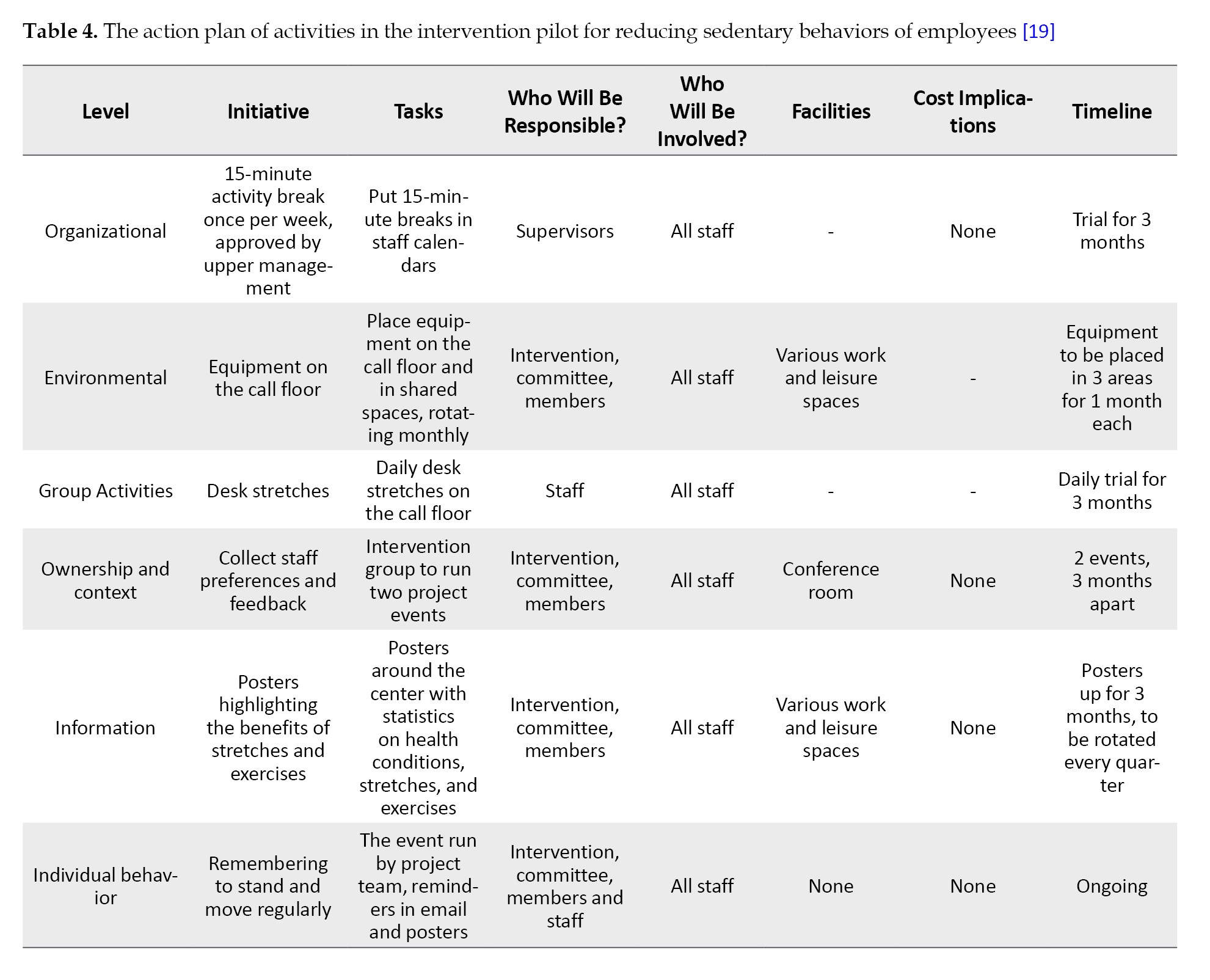 - Tirman L, Biggs H, Morrison K, Manner J, Sivaramakrishnan D, Baker G, et al. Stand up for health: Programme theory for an intervention to reduce sedentary behaviour in contact centres. Eval Program Plann. 2021; 89:102002. [DOI:10.1016/j.evalprogplan.2021.102002] [PMID]