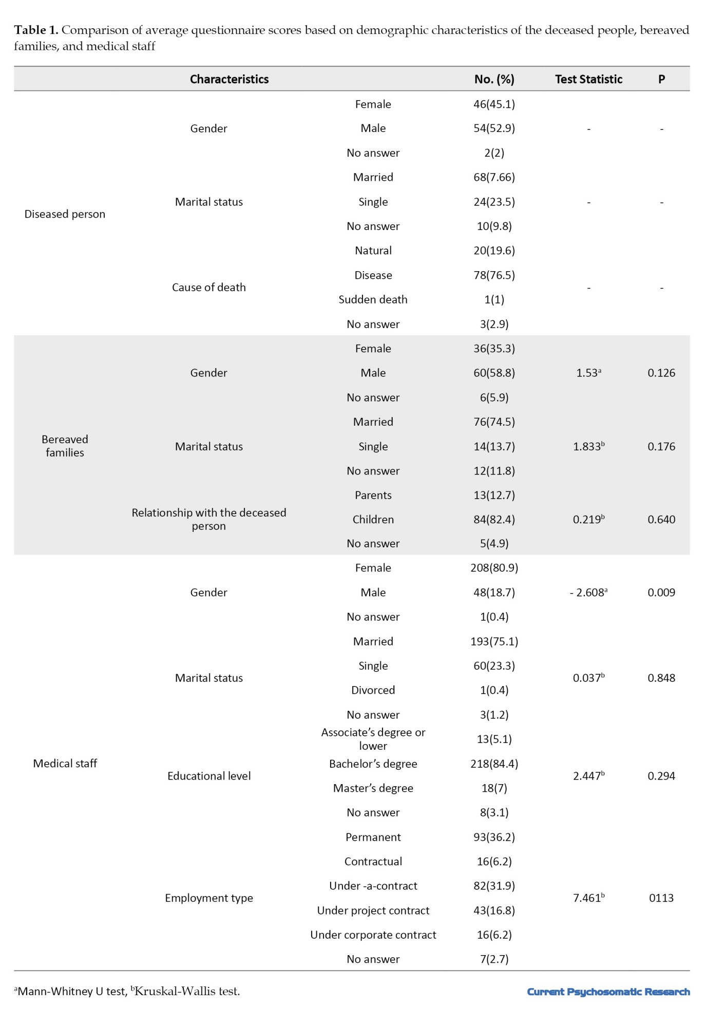 Before distributing the questionnaire, the study objectives and methods were explained to the participants, and their informed consent was obtained. Depending on the conditions of the bereaved families, the questionnaires were completed sequentially or intermittently. For the medical staff, the questionnaires were delivered to the head nurse or unit manager. Then, the researcher visited the units to collect the completed questionnaires. The collected data were analyzed in SPSS software, version 22 using the Kolmogorov-Smirnov test, descriptive statistics (frequency, Percentage, Mean±SD), Mann-Whitney U test, Kruskal-Wallis test, and Spearman’s correlation test.